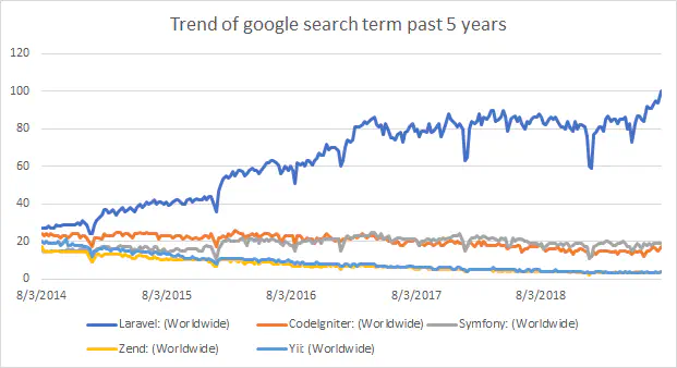 Laravel is a modern PHP framework which requires PHP >= 7.1.3 (for Laravel 5.8). Its popularity is increasing everyday, and as we can see below, it’s is the most searched keyword among Symfony, CodeIgnitor, Yii, Zend which are also the frameworks of PHP.