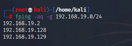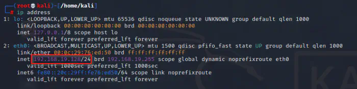 During my run, it showed that my IP address is 192.168.19.128 with subnet mask prefix 24. Now, this means that the network is 192.168.19.0/24.