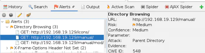 After running the attack, we got some alerts like follows. In addition to the previous results, it said that some directory browsing is possible. So, let’s head towards “/manual” URL path.