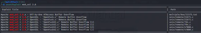 Now, let’s do some research on the results on the internet or using a tool called searchsploit. I didn’t find any important for mod_perl. However, I found something for mod_ssl version 2.8. Below are the screenshots.