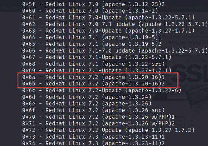 Now, as we scroll through the output, we see different offsets for different targets. Since we know our target is Apache in Red Hat Linux, let’s search for that.