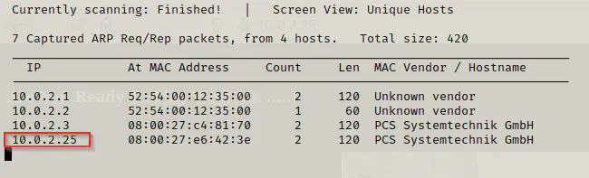sudo netdiscover -i eth0 -r 10.0.2.0/24