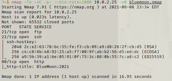 nmap -T4 -sC -sV -p- --min-rate=1000 10.0.2.25 -oN bluemoon.nmap