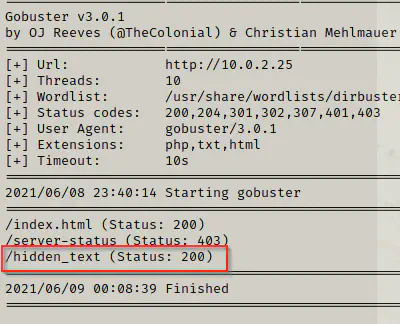 gobuster dir -u http://10.0.2.25 -x php,txt,html --wordlist /usr/share/wordlists/dirbuster/directory-list-2.3-medium.txt -o bluemoon.gobuster