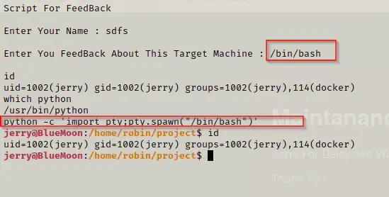 When I provided the input /bin/bash, it gave me a shell as jerry. Then, I spawned a pty shell as follows.