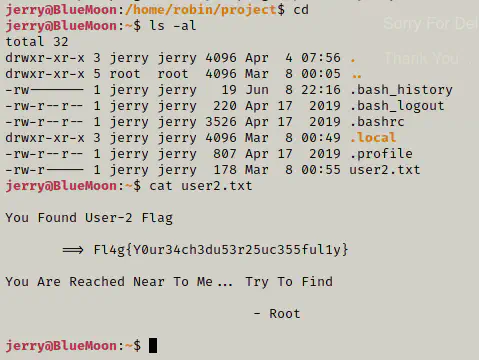 Finally, we got the flag for the user robin. Then, I checked if there are other users in the machine and found there is one called jerry.