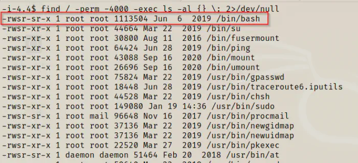 Next, when I searched for the suid binaries, I found out that bash has setuid enabled.