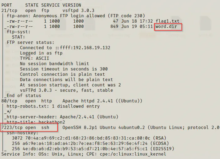 Firstly, anonymous ftp access is allowed. Then, it is evident from the scan results that there is a dictionary file which we can use to bruteforce different logins. In my mind, I am going to use the dictionary list to bruteforce the SSH service running at port 7223. So, I logged in to the FTP server.