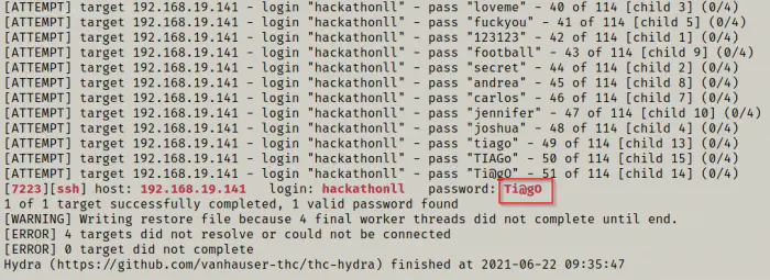 hydra -V -l hackathonll -P word.dir 192.168.19.141 ssh -s 7223