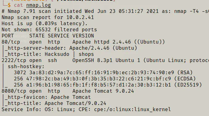 It’s a good habit to store the scan results in a file. We can now see that I have a tomcat webserver running on port 8080 whereas another web application runs on the default port 80. Also, the SSH service is running on a different port than 22. Furthermore, I looked into the application and found out that it’s a very poorly managed PHP web app.