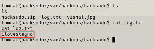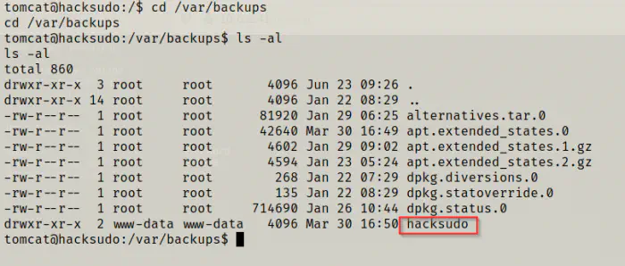 On the /var/www/backups, there is a directory called hacksudo and inside there, there are some files.