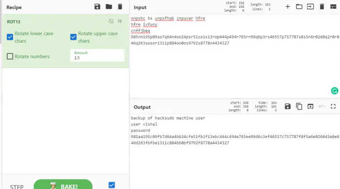In the text above, we can see that there are some words which are kind of jumbled. However, in any encryption or hashing techniques, we don’t see distinct words like these. So, I went to decode using caeser cipher (ROT13). In ROT13, the characters are rotated 13 characters ahead. That is to say, ‘a’ become ’n’, ‘b’ becomes ‘o’ and so on. To do that, I dragged the ROT13 operation to my recipe and checked the result.