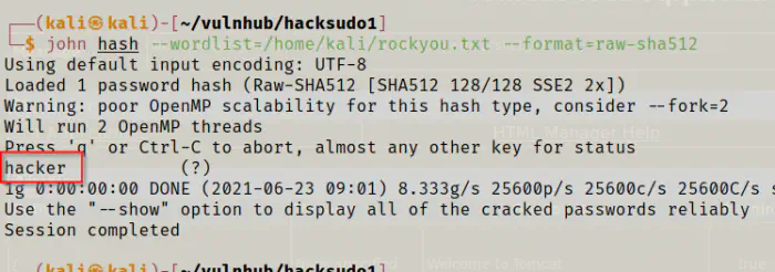 john hash --wordlist=/home/kali/rockyou.txt --format=raw-sha512