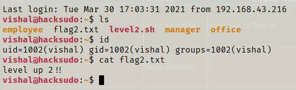 The user vishal is just an intermediate user. However, for the user flag, I have to get to the hacksudo user. Also, we can see that there are some directories in the home of vishal. One that interests us is the directory office.