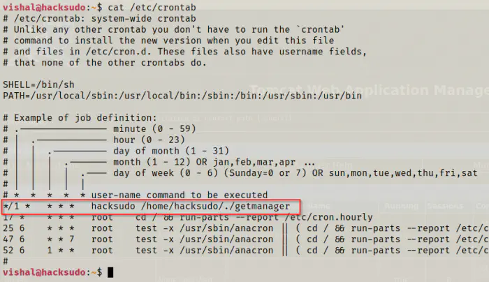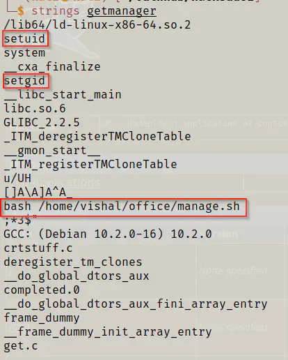 From the screenshot above, we can see that a script getmanager is being run by the user hacksudo every minute. So, I decided to see the content of the binary. Since the binary strings isn’t installed on the machine, I decided to download the binary to my local machine.