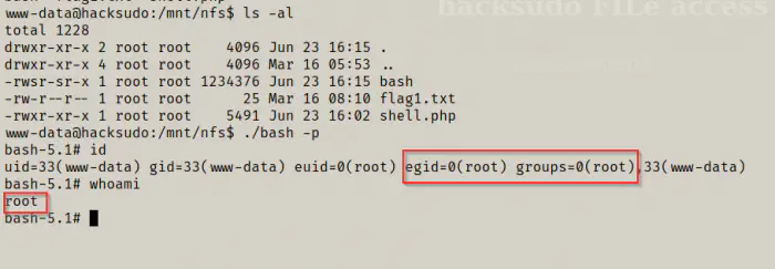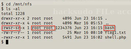 So, the binary bash with setuid permissions of the root user should be present in the /mnt/nfs directory of the target machine. Hence, I listed the permissions of the binary.