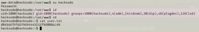 The cracking was successful and we got the password for the user hacksudo. Thus, I logged in and captured the user flag.