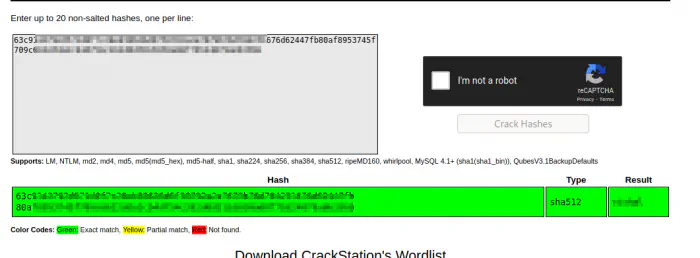 It looked like the text was rotated 13 characters forward. Anyway, we got the username and what looks like a SHA512 hash. Therefore, I visited crackstation to crack the hash.