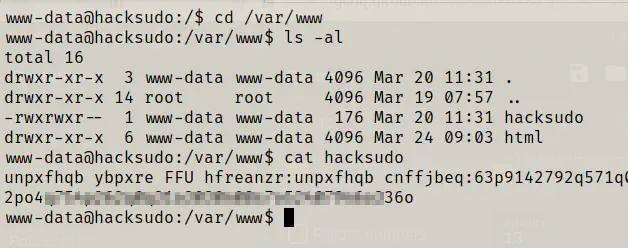 Since I got the foothold, I tried looking inside different directories. Some common directories that I always look are /, /var/www, /var/www/html, /opt, /etc/, etc. Fortunately, there was a file “hacksudo” which had some obscure content.