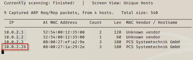 sudo netdiscover -i eth0 -r 10.0.2.0/24