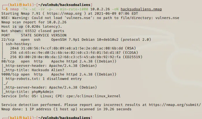 nmap -T4 -sC -sV -p- --min-rate=1000 10.0.2.26 -oN hacksudoaliens.nmap