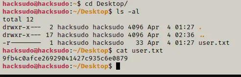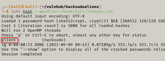 Finally, we got the hash of the user hacksudo. So, I copied the hash and pasted it in a file named “hash” in my local machine. Then, I used john the ripper and rockyou.txt to crack the password.