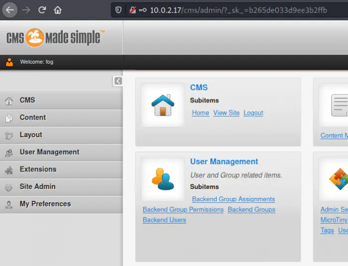 There is a dictionary list and a CMSMadeSimple CMS website. After some time I also found another path in the enumeration called /fog. Then, I opened the path but it’s empty.