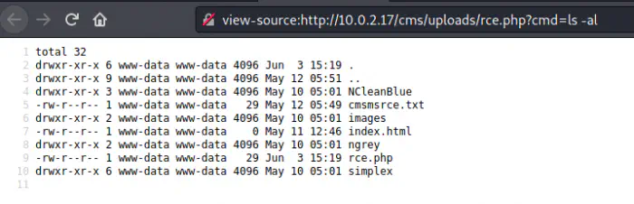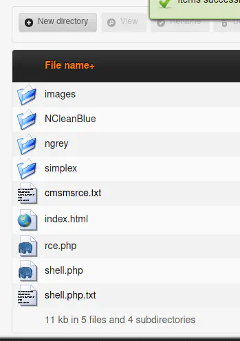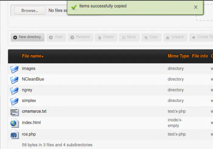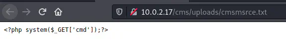 I copied the file using the copy feature of the file manager. From now, I can execute remote commands from the get parameter. e.g. http://10.0.2.17/cms/uploads/rce.php?cmd=ls -al
