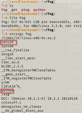 However, there is a directory fog which contains an binary with the same name. We can look up it’s content by using strings command.