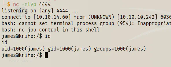 Now, my next step would be spawning a reverse shell. Hence, I started listening on the port 4444.
