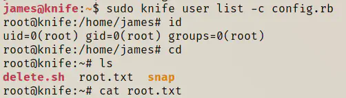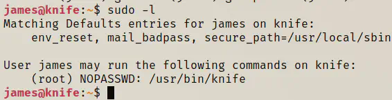 The user could execute the binary knife as the root and without requiring his own password. So, I decided to run what the binary did.