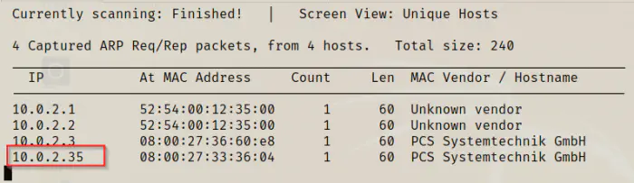 sudo netdiscover -i eth0 -r 10.0.2.0/24