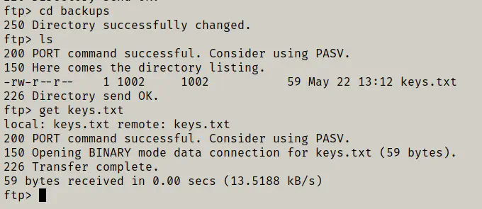 We only have read access to the directory. Likewise, there is a directory called backups which has a file called keys.txt. That didn’t give me anything.