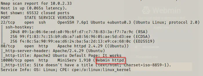 As we can see above, we have one interesting service available at port 10000 which is webmin. This service allows a user or administrator to remotely manage the machine. Hence, if we could get access to this server, we could enter the system. However, it’s not that easy.