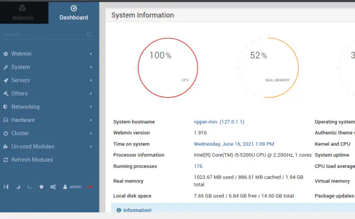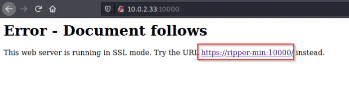 The webmin server didn’t work without SSL. Instead, I got a message that hinted me the host of the machine. So, I added it to hosts file, although there isn’t any use of it in upcoming steps.