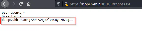 While enumerating, it’s always important to look at the robots.txt file. On the webmin’s robots.txt file, I got something on base64 format.