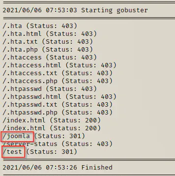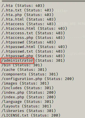 gobuster dir -u http://10.0.2.22/joomla -x html,txt,php --wordlist /usr/share/wordlists/dirb/common.txt
