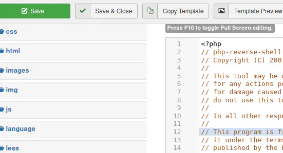Since the user has admin roles, he can edit the templates so that he could inject a PHP webshell. A webshell simply gives us a pseudo-shell. In Kali Linux, the webshells are available in the /usr/share/webshells directory. So, first of all, I have to copy the webshell and edit it accordingly.