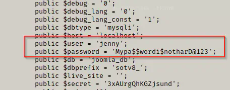 As can be seen, we have two users on the machine where we couldn’t change our directory to. Hence, we can look for some credentials in the joomla config file where we can find the mysql login credentials. As we know, the common mistake of most people is reusing password.