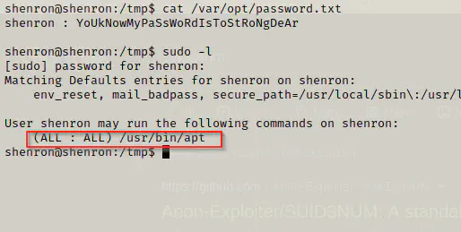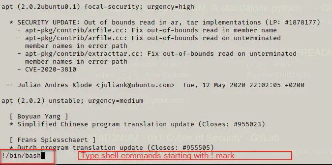 That’s it. I got the password of shenron and when I listed the sudo rights, I found out that he can execute apt command for all users. An important thing about apt is it uses a linux utility called less which allows the execution of shell commands. For example, if we try to view changelog of a package, we can execute shell commands during that moment.