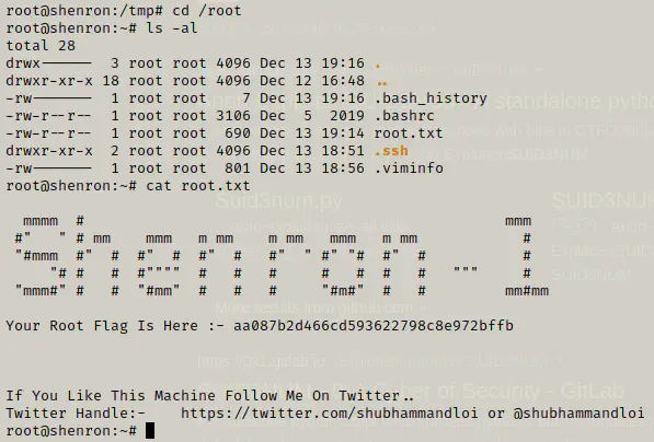 As we can see above, the user jenny has right to copy on shenron’s privileges. Like we got the access of SSH of the user jenny, we can do the same for the user shenron. Since we already have copied our public key in the authorized keys of jenny, we can copy the file to shenron’s. However, this time, we have to run the command with the permission of shenron. But there is an issue that the user shenron may not have access to read jenny’s file. Jenny has access to copy where she needs access of shenron, however, the reverse might not be true. Nonetheless, /tmp has access to all users. So, jenny can copy the authorized keys to /tmp and shenron can further copy that to his .ssh directory.