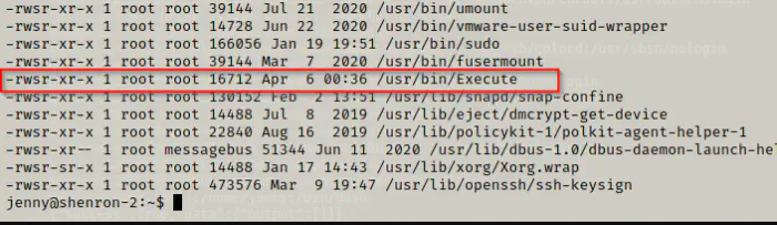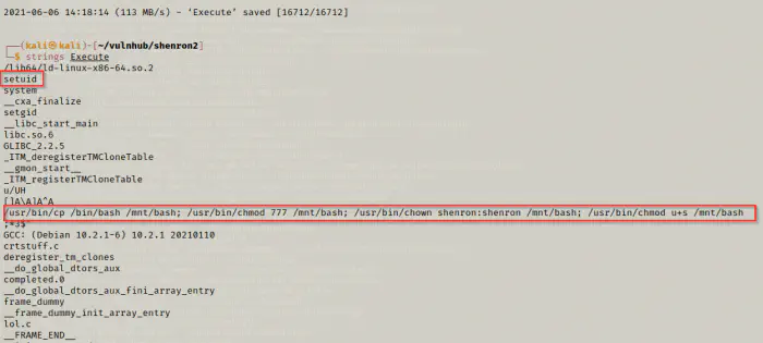 On the screenshot above, the highlighted lines say that a bash is copied to a new location, provided full privileges, changed the owner to shenron and given the setuid permission.