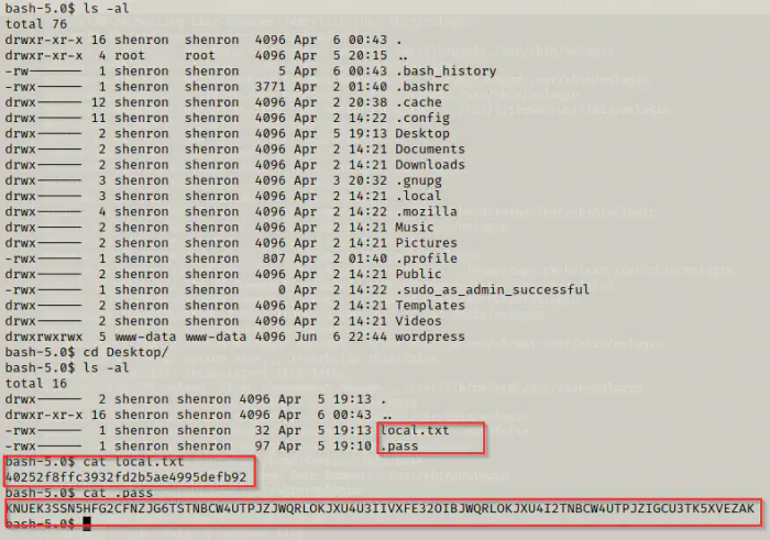 We found the flag of the user shenron. Furthermore, we have an encoded text which might be a password. We could try decoding it with base64 and base32 respectively.