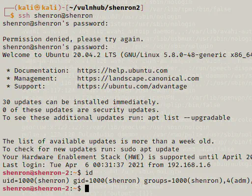 I did SSH using shenron and I got the access to the user. Now, I can check the sudo permissions.