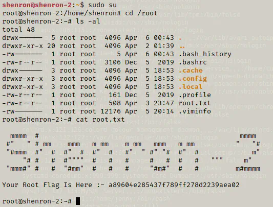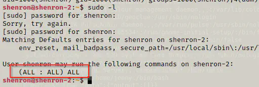 It says that the shenron can run all commands with privileges of all users and groups. Now, I can simply switch to the root user.